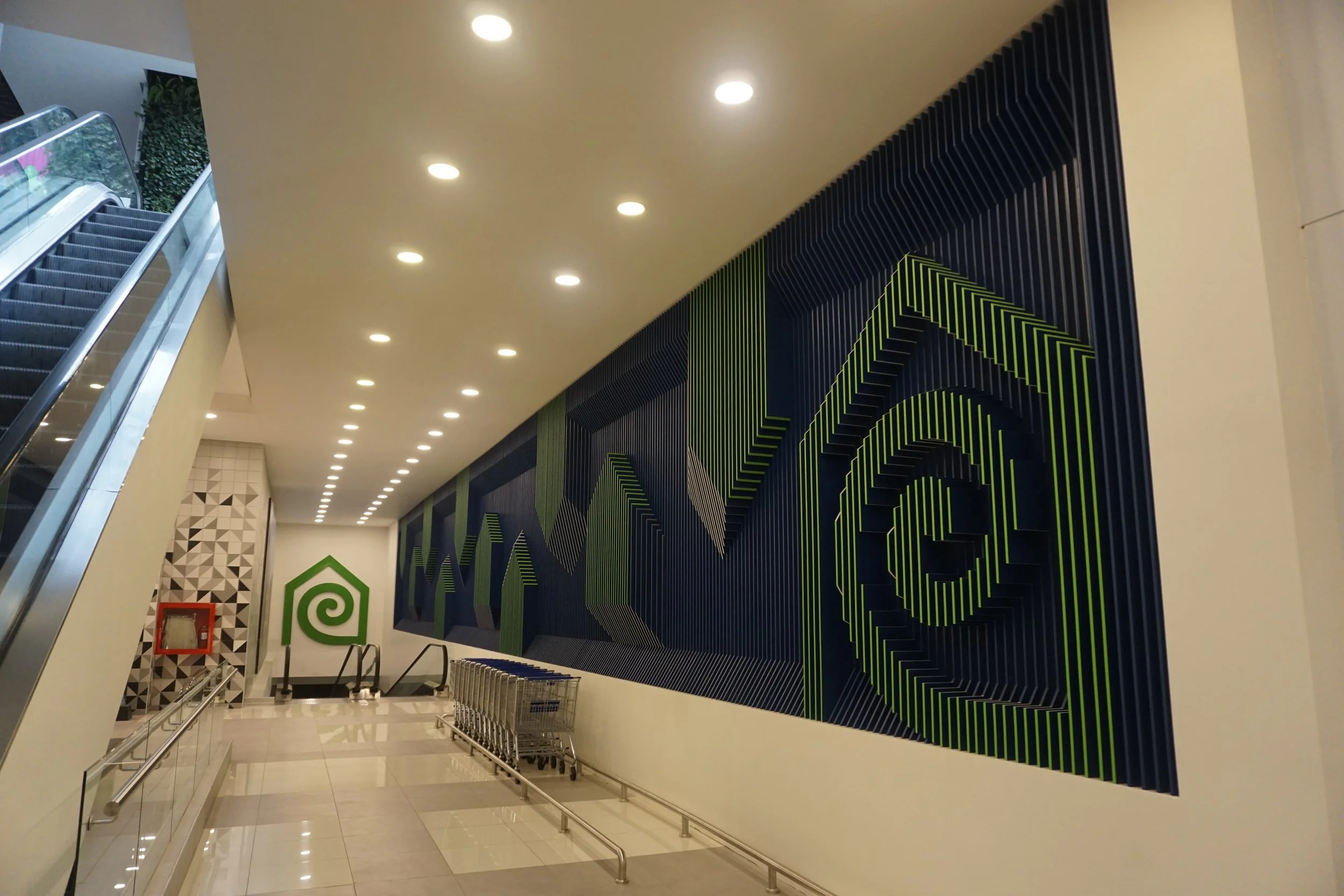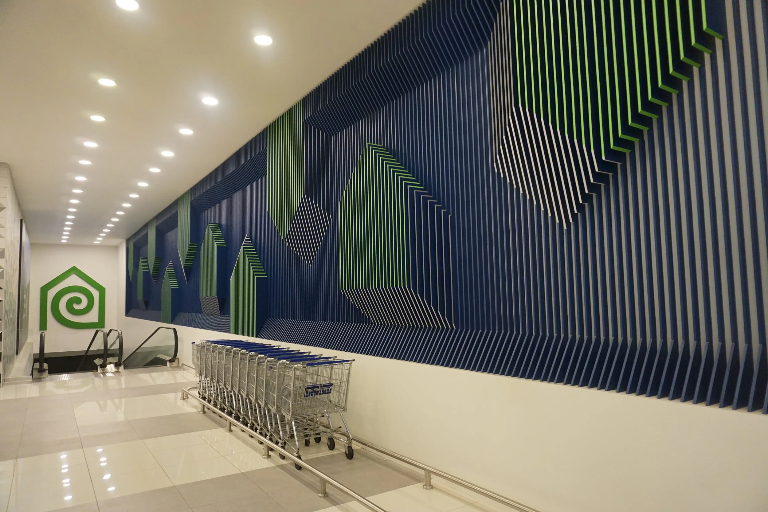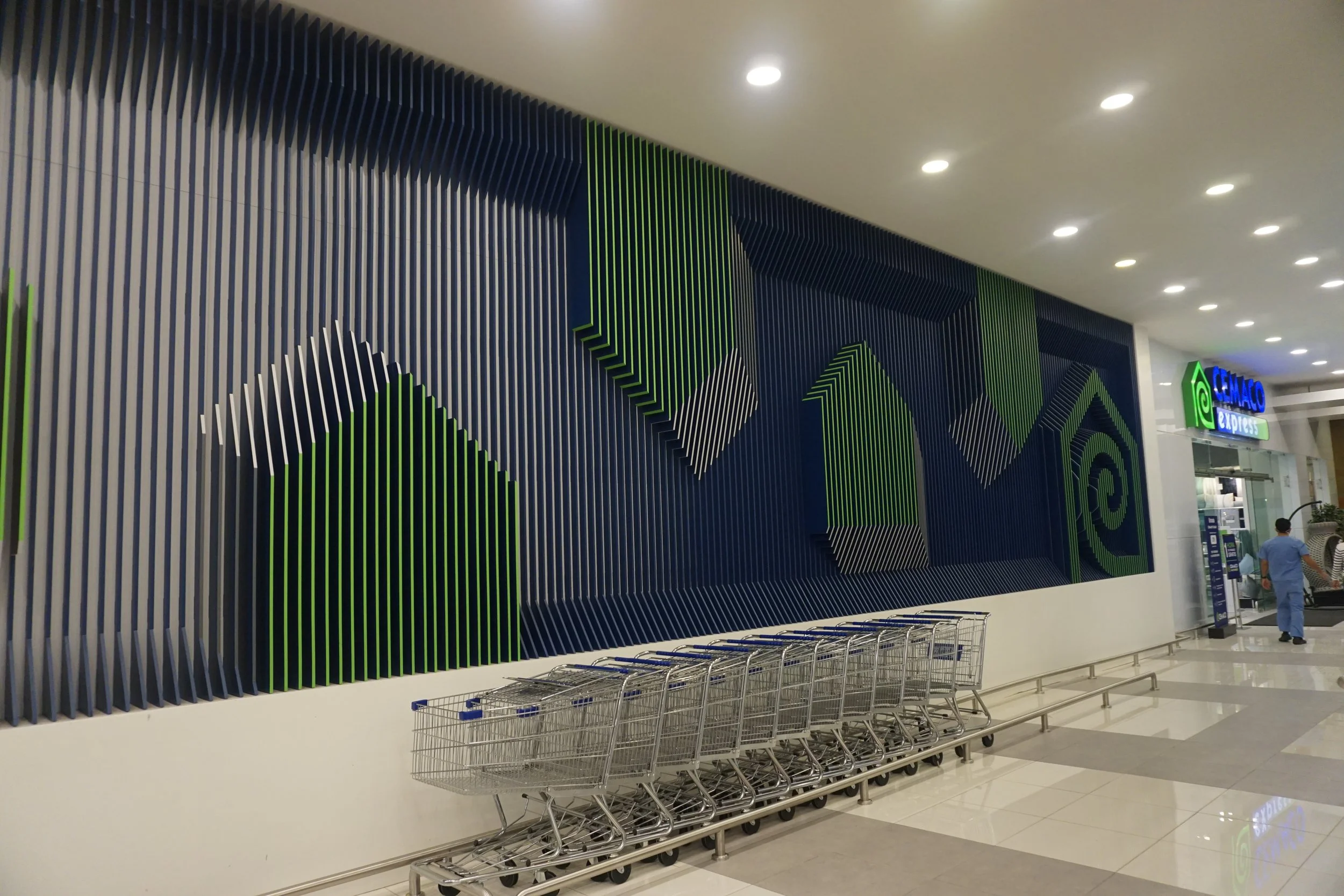 Pieza en planos seriados de aprox. 30mts de largo x 3.40 mts de alto, diseñada en colaboracion con la Arq. Denisse Levy para Cemaco La Noria, Zona 14, Guatemala.